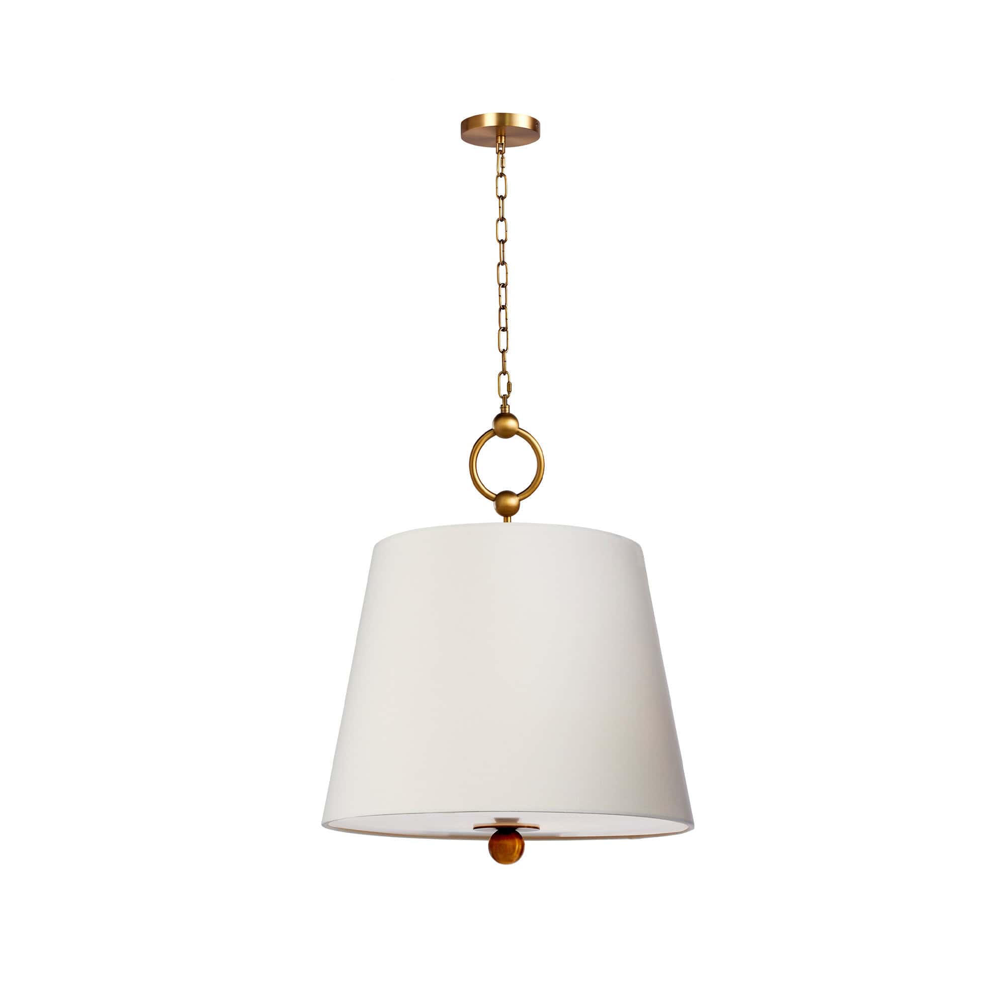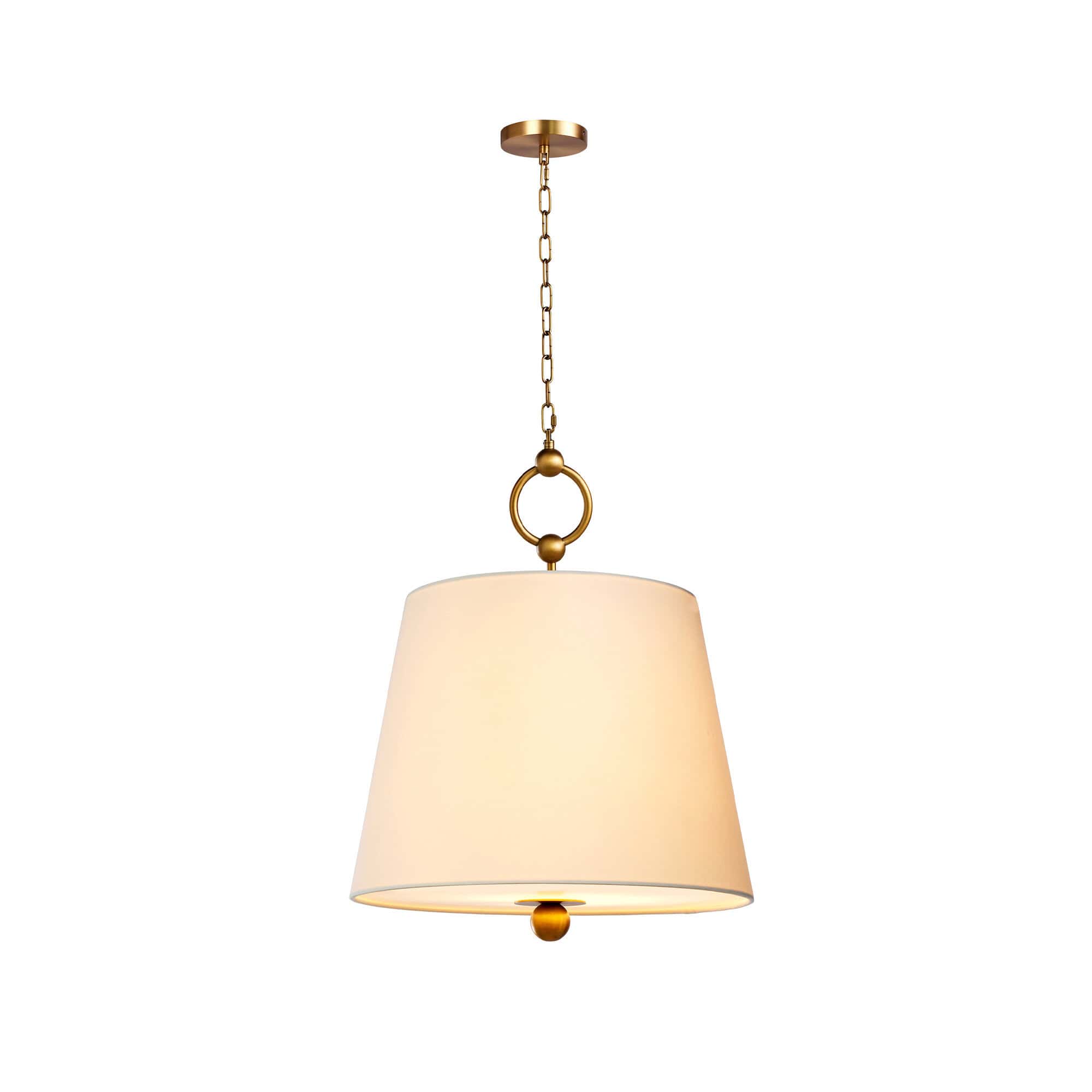 The Lumiere de Lien Pendant is a beautifully designed pendant light that combines elegant materials and clean lines. It features a soft, translucent fabric shade with a subtle texture, creating a warm and inviting glow. The shade is suspended from a delicate chain, anchored by a circular metal link with brass detailing. This pendant exudes sophistication, with the smooth metallic ring adding a touch of vintage-inspired charm, perfectly complementing the modern shape of the shade. Ideal for spaces requiring both functionality and a refined aesthetic. The Lumiere de Lien Pendant brings a sense of calm and balance to any room.